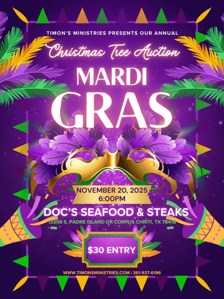 Timon’s Ministries invites you to our Annual Christmas Tree Auction and this year, we’re bringing the Mardi Gras magic!